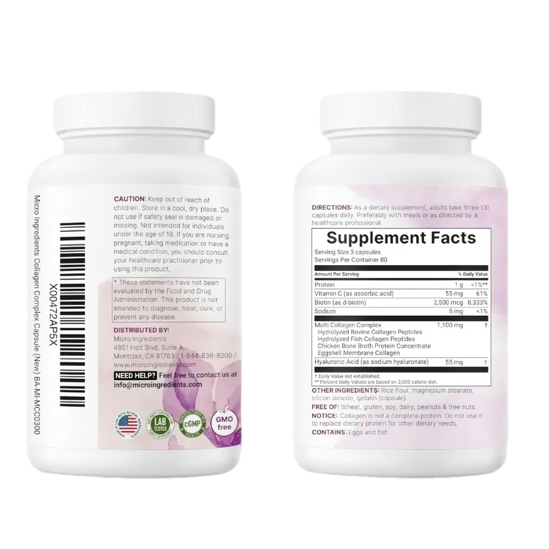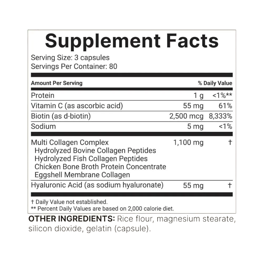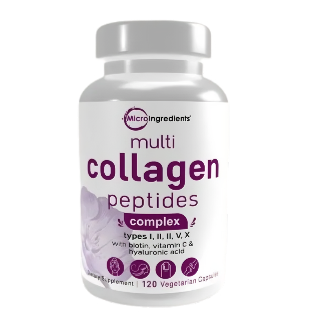 Multi Collagen Complex Peptides es un suplemento nutricional formulado con múltiples tipos de colágeno (tipos I, II, III, V y X), combinados con biotina, vitamina C y ácido hialurónico, componentes comúnmente presentes en los tejidos del cuerpo humano.