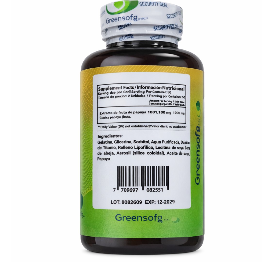 Este suplemento alimenticio está formulado con extracto de fruta de papaya (Carica papaya), reconocido por sus propiedades digestivas y su aporte natural al bienestar del organismo. Su presentación en cápsulas facilita su consumo diario, siendo ideal para personas que buscan mejorar su digestión y complementar su alimentación de manera práctica.